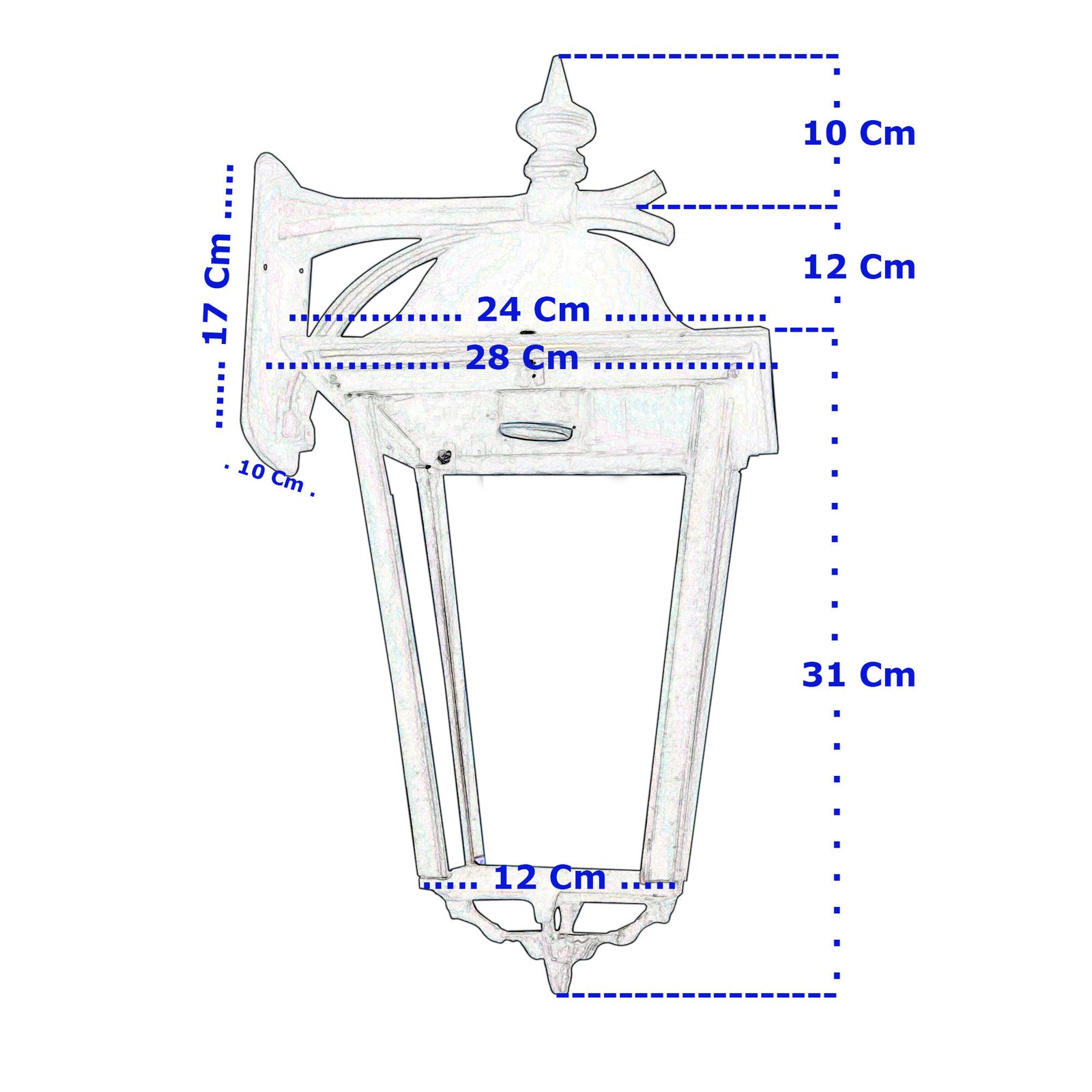 Medida Farol Ménsula : Alto = 53 cm – Ancho Superior = 24 Cm – Ancho Inferior = 12 Cm – Ménsula = 17 x10 Cm