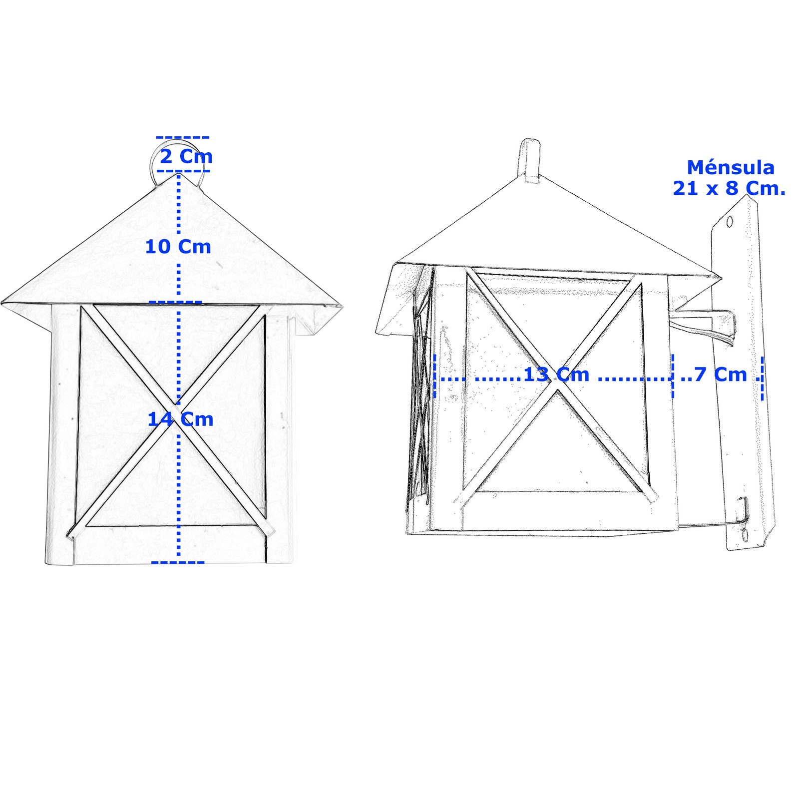 Medidas del farol: Altura: 26 Cm. – Ancho: 13 Cm. – Profundidad Total:  20 Cm.